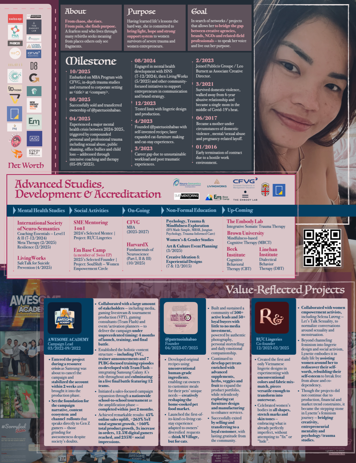 while going all in on her passion for women empowerment, she realizes she doesn’t need to fit into any stereotypes if she can be unapologetically herself: an analytical storyteller and impact-driven creative who brings order to chaos, turns pain into purpose and rises from many rebirths while striving for work that lives beyond awards.